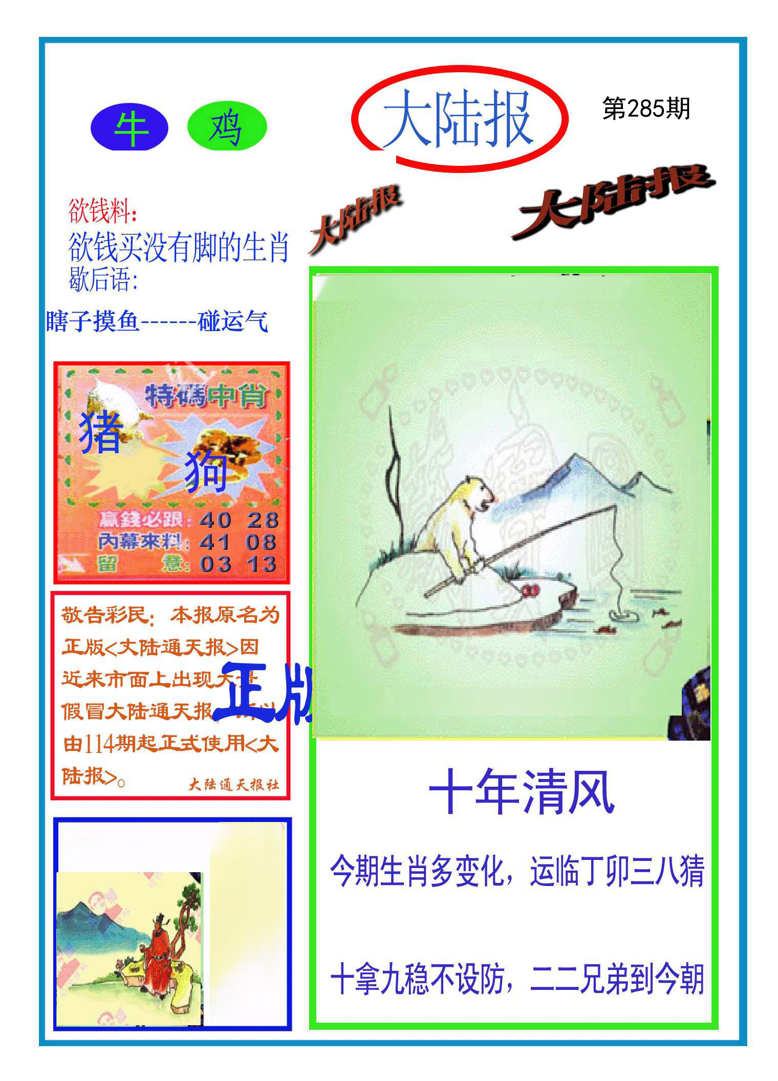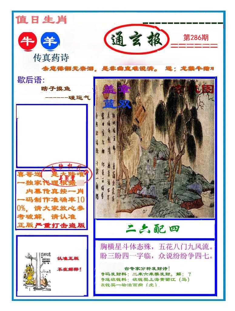285期: ⑨肖 | 蛇龙马猴兔狗羊牛虎 | 牛29中 |