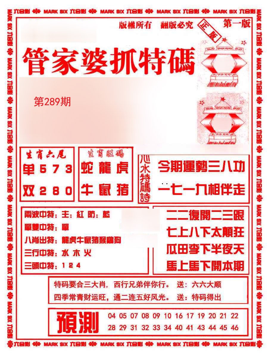 289期: ⑥肖 | 鼠猪兔羊虎马 | ????中 |